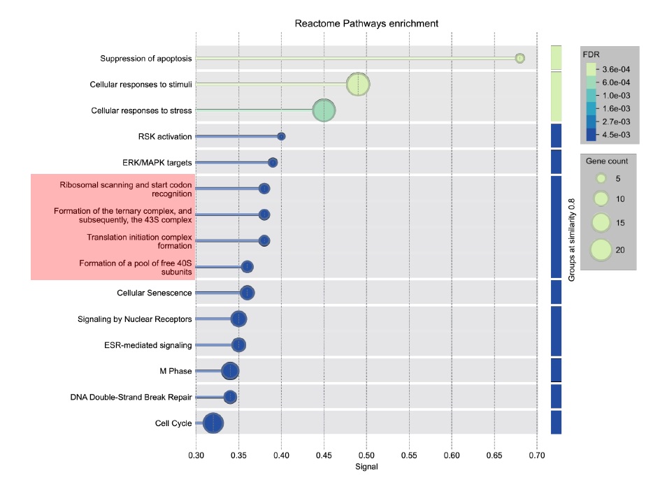 Our re-analysis of a CRISPR/Cas9 screen (Durocher lab) and an siRNA screen (Helleday lab) identified protein synthesis genes as common determinants of radiation survival (Figure 1.). Protein synthesis is frequently reprogrammed in cancer, with changes in nucleolar size, rRNA/tRNA production, and translation initiation and elongation. Onco-ribosomes and ribosomal protein mutations have been reported as oncogenic drivers [1], and 46% of colorectal cancers harbour an oncogenic 18S rRNA variant also found in other tumours [2].
